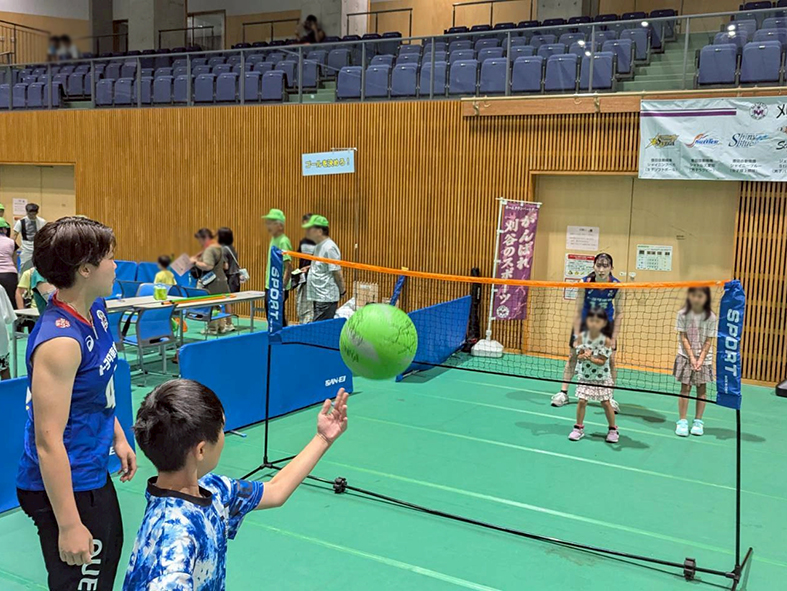 ソフトバレーボールを使ってのサーブやレシーブにチャレンジしながら、選手との交流を楽しむ参加者の姿がとても印象的でした。