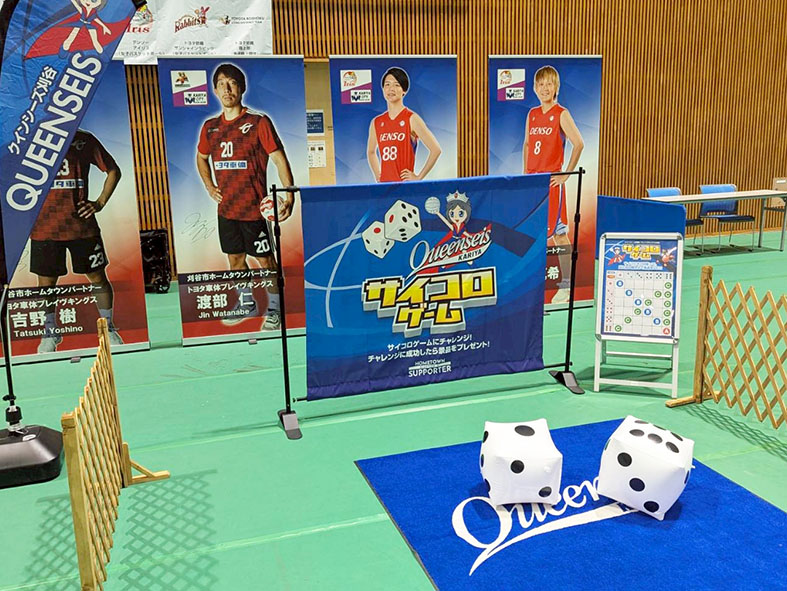 今回、クインシーズ刈谷は刈谷市ホームタウンパートナー啓発ブースとして出展しました。ブースでは、おなじみの「サイコロゲーム」を開催!出た目に合わせて景品がもらえるシンプルだけど誰でも楽しめるゲーム♪