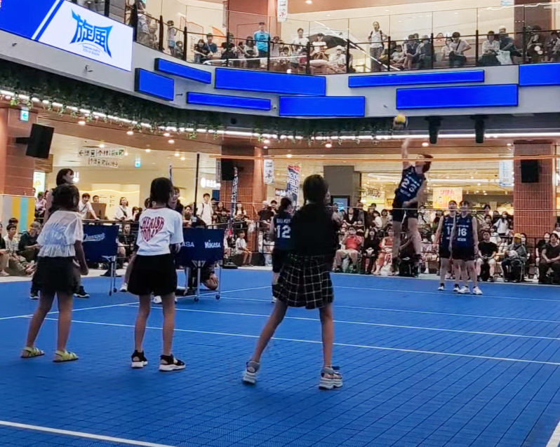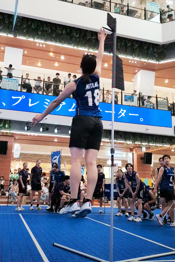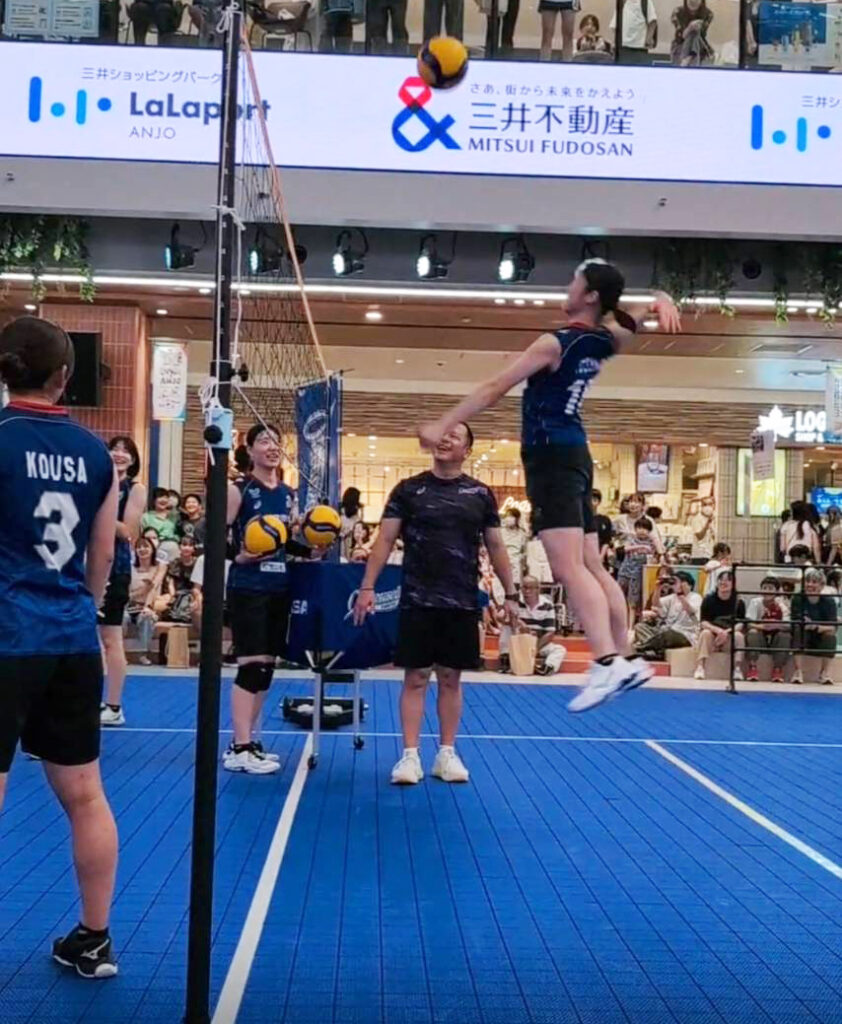 リベロ&セッターの華麗なレシーブ、そして迫力のスパイクを間近で体感!徐々に熱が入ってくると威力が増していき、ボールが手に当たる音や床に叩きつけられる音が響き渡り、お客様からも歓声の声があがりました。
