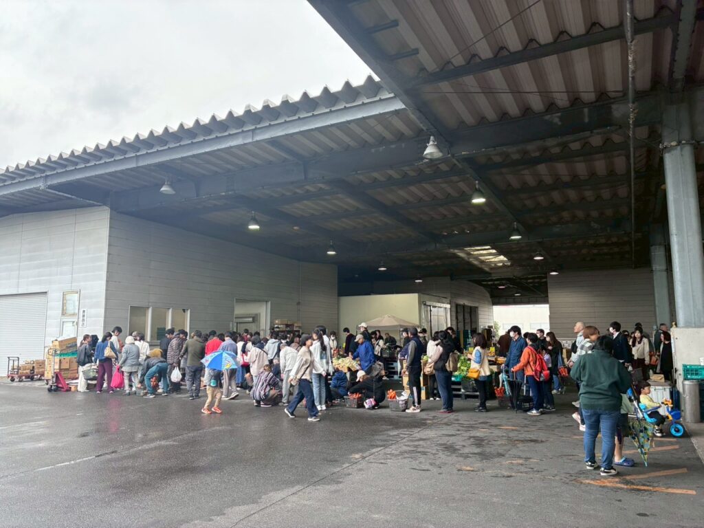 当日はあいにくのお天気でしたが、朝からたくさんの人で賑わっていました。青果市場のほうでは野菜の詰め放題や市場ならではの新鮮な野菜や果物が立ち並び、地域の飲食・雑貨・体験ブースもたくさんで大賑わい✨